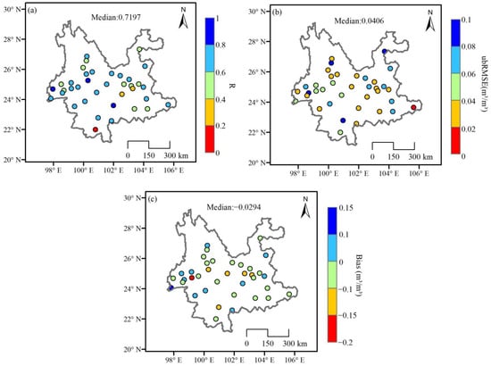 Validation results of the reconstructed SM data using in situ observations: (a) R, (b) ubRMSE, and (c) Bias.