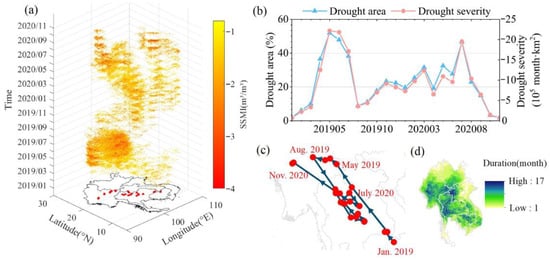 Three-dimensional identification results of the most severe drought from January 2019: (a) three-dimensional drought event; (b) temporal evolution of area and severity; (c) centers routine of the drought event; (d) spatial distribution of duration.