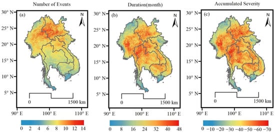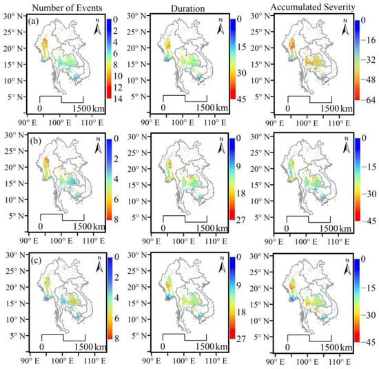 Spatial patterns of different drought characteristics: (a) number of events, (b) duration, and (c) accumulated severity.