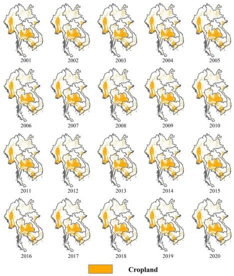 To analyze the cropland’s exposure to agricultural drought events, the cropland in the MODIS land cover data was extracted from 2001 to 2020, as shown in Figure 10. During 2001–2020, the average cropland was 4.97 × 105 km2 over the GMS. Spatially, large areas of continuous cropland were distributed in central and southern Myanmar, central and southern Thailand, and the Tonle Sap Lake floodplain in Cambodia. In contrast, Yunnan Province, Vietnam, and Laos had a sporadic cropland distribution with a relatively small area. Since the cropland area had remained stable over the past two decades, the cropland area exposed to drought mainly depended on droughts rather than cropland expansion. Table 3 presents the characteristics of cropland exposed to the identified agricultural droughts. The data illustrate that the cropland area affected by agricultural droughts ranged from 0.07 to 4.72 × 105 km2, with an average value of 1.71 × 105 km2, accounting for 34% of the total cropland over the GMS. As expected, the four severest drought events (Nos. 5, 9, 18, and 20) affected more than 80% of the total cropland area.