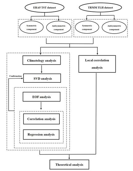 The variables, for example, the TST or TLH, are divided into two components: equatorially symmetric and antisymmetric. Assuming the TST over the Northern Hemisphere is A, and the TST over the Southern Hemisphere is B with the latitude reversed. The symmetric component is defined as 1/2 (A + B), and the antisymmetric component is 1/2 (A − B) in the Northern Hemisphere and 1/2 (B − A) in the Southern Hemisphere. Therefore, the original field can be divided into the sum of symmetric and antisymmetric fields. Note such a decomposition on the TST, rather than on SST only, can take the intrinsic asymmetry of land–sea contrast into consideration, and hence it may better reveal the coupling of land, sea, and atmosphere over the tropics.