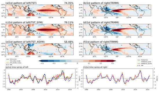 The left (a) and right (b) spatial pattern of the first mode of SVD using TST and TRMM-based TLH. The squared covariance fraction of the first mode, expressed as a percent, is printed on the upper right-hand corner of each map. (c,d) and (e,f): same as (a,b), but using symmetric and antisymmetric components of TST and TLH, respectively. (g,h): The time series of the expansion coefficient of the three left patterns and three right patterns, respectively, the blue dotted line is the seasonal-averaged Nino 3.4 index.