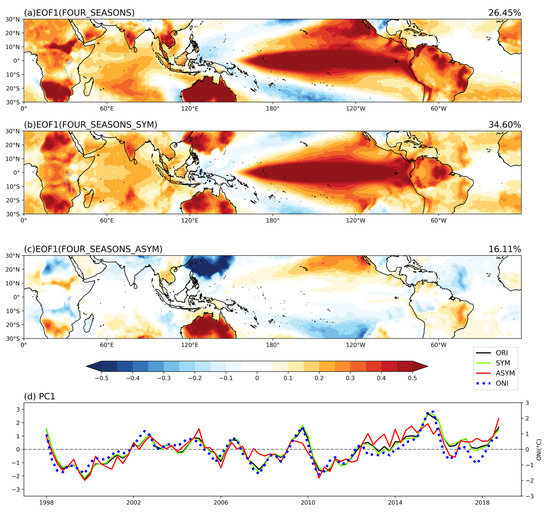 To further prove the results obtained from the SVD analysis, we independently employed the EOF analysis for the original seasonal TST anomaly and its symmetric and antisymmetric components (Figure 4). We find the first EOF (EOF1) mode of the seasonal TST anomaly resembles the first left (TST) SVD model in Figure 3a, both indicating the pattern of El Niño events. Furthermore, the EOF1 mode of the symmetric TST in Figure 4b shows a very high similarity with the EOF1 of the original TST (Figure 4a), with the pattern correlation being 0.99, with a significance level less than 0.01. However, the EOF1 mode of the antisymmetric TST (Figure 4c and Table 3) indicates there is also a weaker but non-negligible antisymmetric TST component across the whole-tropics. In addition, the correlation between the corresponding principle components (PCs) of the EOF1 of symmetric and antisymmetric TSTs is 0.82 (Figure 4c and Table 3), with a significance level of less than 0.01. In short, it can be concluded that while the principal EOF mode of TST interannual variability is dominated by its equatorially symmetric component, there is a non-negligible equatorially antisymmetric component that well co-varies with the symmetric part over most parts of the tropical land and ocean areas. Figure 4d (see also the correlation coefficients in Table 4) shows that the PC1s of original, symmetric, and antisymmetric TST fields are consistent with the evolution of El Niño conditions in the tropical Pacific.