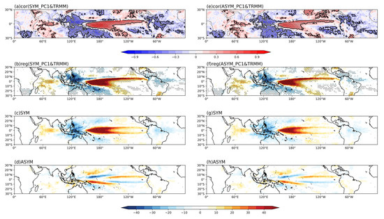 Then we further reveal the link between the symmetric or antisymmetric components of TST and the TRMM-based TLH by calculating the correlation (Figure 5a,e) and regression (Figure 5b,f) of the TLH with/onto the corresponding PCs of the EOF1 of symmetric and antisymmetric TSTs. The regression patterns of TLH in Figure 5b,f are also further separated into equatorially symmetric and antisymmetric components in Figure 5c,d (regressed onto PC1 of the symmetric TST) and in Figure 5g,h (regressed onto PC1 of antisymmetric TST), respectively. It is obvious that the correlation or regression patterns of the TLH associated with the PC1 of symmetric TST (the left panel of Figure 5) are very similar to that associated with the PC1 of antisymmetric TST (the right panel of Figure 5). As such, we confirm the results obtained from the SVD analysis are right.