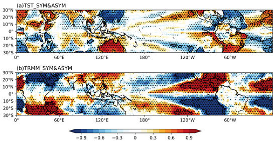 The local correlation between equatorially symmetric and antisymmetric components of (a) TST and (b) TRMM-based TLH. The areas with a significance level of less than 0.05 are dotted.