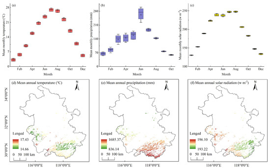 The study area is located in Anhui Province (114°54′–119°27′E, 29°41′–34°38′N), a landlocked province located in eastern China (Figure 1a). The province is characterized by a temperate monsoon climate with distinctive seasonality [28]. In this study, we focused on the forested area with no forest-type change during 2001–2020 in Anhui Province, hereafter referred as “the study area” (Figure 1b). The total area of our study area is approximately 8363 km2, with a mean annual temperature range of 14.66–17.43 °C, a mean annual cumulative precipitation range of 836.14–1685.37 mm, and a mean annual solar radiation range of 193.22–196.10 w m−2 (Figure 2d–f). Figure 2 describes the seasonal dynamics (Figure 2a–c) and the spatial distribution (Figure 2d–f) of climatic variables. Temperature, precipitation, and solar radiation all reach their peaks during summertime (Figure 2a–c). The forest types found in the province include evergreen needleleaf forest (ENF, 3.21%), evergreen broadleaf forest (EBF, 1.20%), deciduous broadleaf forest (DBF, 18.76%), and mixed forest (MF, 76.84%). Forests are mainly distributed in the southern and western regions, characterized by complex terrain which will be described in more detail in Section 2.1.2.