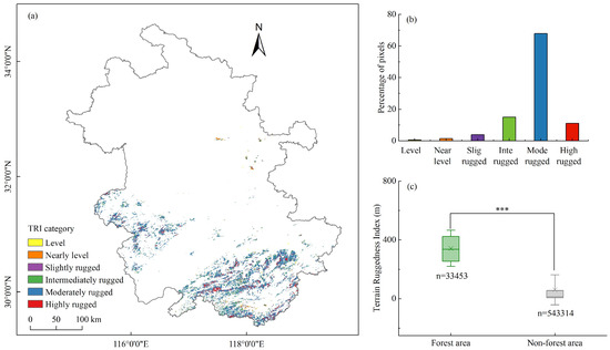 Distribution of the Terrain Ruggedness Index (TRI) in the study area. In Panel (a,b): the six TRI categories include level (0–80 m), nearly level (81–116 m), slightly rugged (117–161 m), intermediately rugged (162–239 m), moderately rugged (240–497 m), and highly rugged (498–958 m). Panel (a): Spatial distribution of the Terrain Ruggedness Index. Panel (b): Percentage of pixels in each TRI category. Panel (c): TRI contrast between forest area (the focus of this study) and non-forest area in Anhui Province. *** indicates highly significant difference between means with p < 0.001.