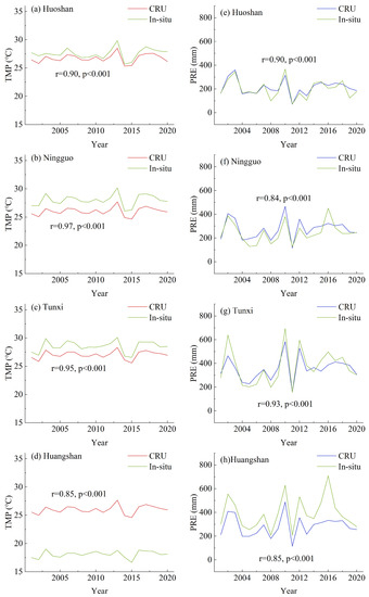 Time series of mean monthly temperatures of July and August (TMP, °C) and accumulative precipitation of March and April (PRE, mm) from in situ meteorological stations (green lines: (a,e). Huoshan station; (b,f). Ningguo station; (c,g). Tunxi station; (d,h). Huangshan station) and from reanalyzed Climate Research Unit (CRU) data (red lines for TMP; blue lines for PRE). r presents the Pearson correlation coefficient of temperature (panel (a–d)) and precipitation (panel (e–h)) between in situ data and CRU data for each meteorological station.
