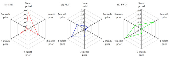 Correlation coefficient (r) between the EVIJul–Aug and temperature, precipitation, and solar radiation data within six time windows (same, 1-month, 2-month, 3-month, 4-month, and 5-month prior to July and August) are shown in Figure 5. The average EVI of July and August had the highest absolute spatial average r, with temperature in the same period (r = 0.53, indicating no time lag), with precipitation and solar radiation in 4-month prior (r = 0.46 for precipitation, r = −0.54 for solar radiation, indicating 4-month time lag). This means that forest growth in July and August had the strongest positive correlation with mean temperature in July and August, and had the strongest positive or negative correlation with accumulative precipitation or mean solar radiation in March and April, respectively. Furthermore, these results also enabled us to identify the most dominating climatic factor for each pixel.
