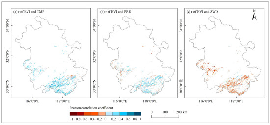 The Pearson correlation coefficients (r) of the Enhanced Vegetation Index (EVI) with each of the three climate factors—mean monthly temperature (TMP, (a)), accumulative precipitation (PRE, (b)), and mean monthly solar radiation (SWD, (c)) in the study area.