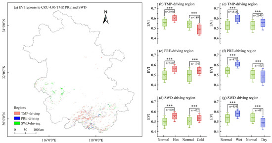 The results of our t-test showed the EVI response to temperature and precipitation changes in Figure 7b–g: (1) In the TMP-driving region (Figure 7b), the EVI in the hot year was significantly greater than in the normal year, while significantly lower than the normal year in the cold year. This means that the EVI increased with the increase in temperature and decreased with a decrease in temperature. This result implies that warming temperatures may promote forest growth and cooling temperatures may interfere with forest growth in the TMP-driving regions. However, both the EVI in the hot and cold years were significantly greater than the normal year in Figure 7c,d. This means that temperature change (warming or cooling) may not affect the EVI in the PRE-driving region and the SWD-driving regions. (2) In the TMP-driving region (Figure 7e), the EVI in the wet and dry years was significantly greater than in the normal year. This means that precipitation change (wetness or drying) may not affect the EVI. However, both the EVI in the wet year was significantly greater than the normal year in the PRE-driving region and the SWD-driving region, while significantly lower than the normal year in the dry year (Figure 7f–g). This means that the EVI increased with an increase in precipitation and reduced with a decrease in precipitation. This result implies that increased precipitation may promote forest growth whereas decreased precipitation could interfere with forest growth in the PRE-driving region and the SWD-driving region.
