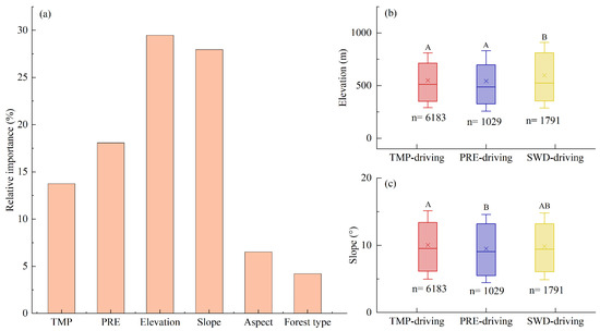 We used a random forest model to analyze the effects of temperature, precipitation, elevation, slope, aspect, and forest type on the EVI from 2001 to 2020. A total of 669,060 data points (33,453 pixels per year × 20 years) were entered into the random forest model. The importance of the six independent variables for the EVI were listed below in a descending order: elevation (29.47%) > slope (27.96%) > precipitation (18.08%) > temperature (13.75%) > aspect (6.52%) > forest type (4.21%) (Figure 8a). Due to elevation and slope being the most important factors, we further analyzed the differences in elevation and slope among three regions dominated by different climatic variables. The results showed that the elevation in the SWD-driving region was significantly higher than in TMP-driving and PRE-driving regions (Figure 8b), while the slope in the TMP-driving region was significantly higher than the PRE-driving region (Figure 8c).