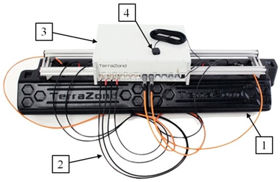 The appearance of the ground-penetrating radar (GPR): 1—antenna array; 2—connecting cables; 3—transceiver module; 4—GPS antenna.