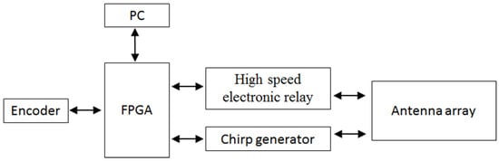 Ground-penetrating radar technology is promising for various studies of multilayered media without disturbing their integrity [24]. The objectives of road pavement diagnostics include determining the thickness of structural layers; detecting engineering communications; obtaining information about their condition, size, and depth [25]; localizing (confirming the presence of) reinforcement mesh [26]; and qualitatively assessing the condition of subsurface layers (moisture, cracking, and swelling zones) [27,28]. TerraZond multichannel wide-aperture ground-penetrating radar (Figure 1) was used as the main measuring tool to obtain GPR data, which has several advantages compared to conventional monopulse GPR systems. Some important characteristics of this radar are listed below. First, this device is a distributed antenna array with high-speed electronic switching, allowing for simultaneous probing through 32 channels with coverage of up to 2.5 m of road width (Figure 2a). This enables evaluation of pavement characteristics and heterogeneities across the entire road surface (Figure 2b) rather than just along a single lane. Secondly, the radar is equipped with a high-speed signal generator based on the principle of LFM location, which provides probing at speeds up to 130 km/h. The GPR includes a UWB antenna block of receiving and transmitting antennas working in the frequency range of 0.71 to 2.6 GHz; a sensitive high-speed LFM generator, providing radar operation at a speed of up to 130 km/h (with a recording density of GPR traces every 10 cm); high-speed electronic relay; and a programmable logic-integrated circuit (PLIC) for receiving, processing, and storing geodata (Figure 3). The GPR antenna array is mounted on the front or rear of the vehicle at a height of 30–40 cm above the road surface (Figure 4). Currently, TerraZond GPR is produced in series and equipped in road laboratories of organizations such as the Russian Road Research Institute and Federal Highway Agency. Advantages of using “Terrazond” multichannel ground-penetrating radar over single-channel systems include: