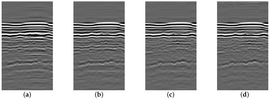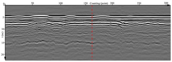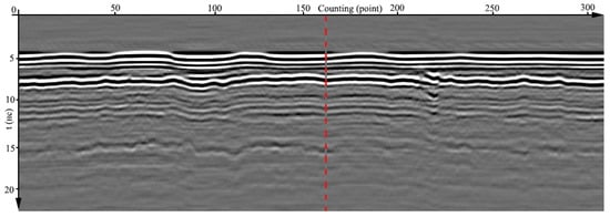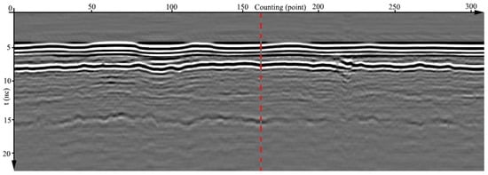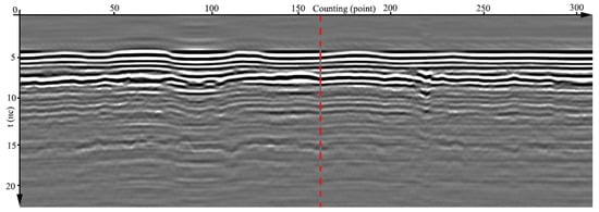 As shown in the figure, due to the multiple interferences between the antenna and the air–medium boundary, in-phase interference arises in the radargram. These interferences manifest as multiple bands, which prevent the determination of the boundaries of road layers. They primarily arise due to the multiple reflections of the probing signal from the road surface and other reflectors that relate to the design of the antenna array and its suspension on the vehicle. The above-described method for filtering in-phase interference can be applied to the experimental data presented in Figure 6.