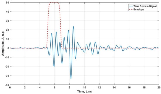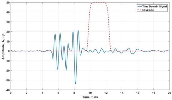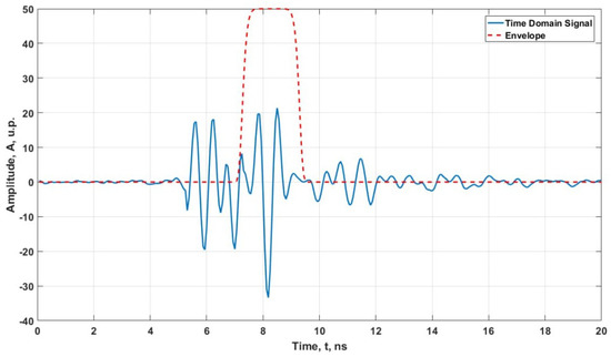 The next step in processing is to apply a window function () to remove the part of the overall signal that corresponds to the signal reflected from the first layer. The width of the window is selected based on the width of the probing signal. The operation is carried out for all signals in the selected spatial observation window.
