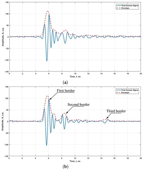 Thus, the proposed processing ensures the removal of in-phase interference from the first layer in the signal. Each subsequent iteration sequentially removes in-phase interference from deeper layers in the signal. The operation can be carried out until the intensity level of the filtered signal exceeds the level of measurement noise variance (). At the end of all iterations, the resulting signal () must be supplemented with the found values with a correction of the temporal position and amplitude.