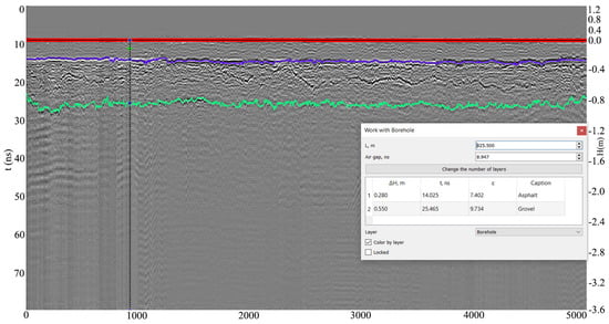 The methodology for calibrating GPR data using “Terrazond” equipment involves data processing in GeoReader software [31]. After drawing the boundaries of pavement layers on the GPR profile, the user identifies the location of the borehole (Figure 16). The red blue and green lines show the boundaries of the pavement layers. The borehole parameters specify the layer thicknesses based on drilling results, and the soil model is recalculated. The software recalculates the pavement layer thickness at each point of the GPR profile with respect to the calibration borehole. The survey results are exported in a test file format with linear and coordinate referencing or a spatial digital model.