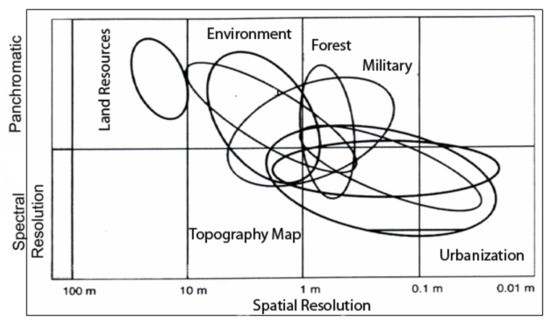 The well-known trade-off between spectral and spatial resolution and data picture processing costs complicates choosing the suitable image resolution even further (Figure 1). Although a comparison of analysis of multispectral (Landsat 8) with moderate resolution imagery from SPOT and aerial photos for a 100 km2 study area [21,22] points to Landsat ETM+, CDA and SPOT 6 to be the cheapest as they are freely available, with DigitalGlobe Worldview 2 imagery the most expensive, there have been few systematic cost comparisons of RS and GIS in comparable research locations.