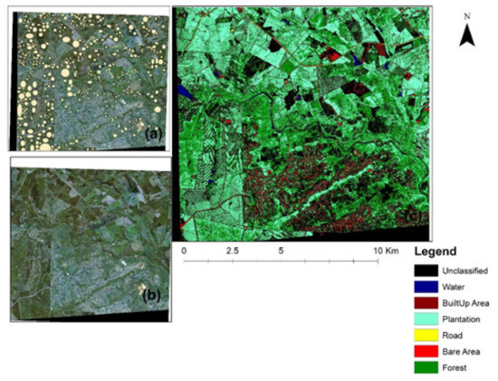 The spatial coverage of the Worldview 2 imagery is illustrated in Figure 5 within the study area. Figure 5a shows the Digital Globe Worldview 2 Imagery with 1.24 m images for sites. The actual colour composite imagery reveals distinct spatial patterns of plantations, forests, orchards, water, bare area and other land-cover classes on each site. Plain regions are distinguished by a light greyish tone, herbaceous plants with a dark green response, and water with brown or blue tones in the actual colour composite image. Image classification resulted in 35.92% Unclassified, 0.22% BuiltUp Area, 25.51% Plantation, 34.91% Forest, 0.53% Road and 0.43% Water. Land-cover classes were identified with an overall accuracy of 80.50% with the associated kappa coefficient of 0.80.