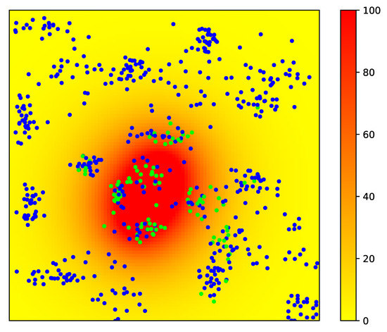 Scheme of the relation between damaged samples and spatial distribution of the demand. Red to yellow tones denote demand. Blue and green marks show undamaged and damaged samples, respectively.