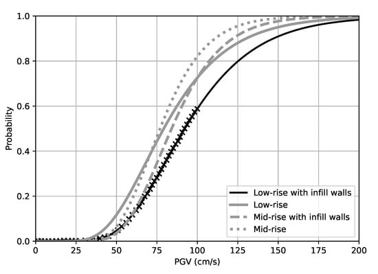 Fragility function adjusted from [59] for low-rise reinforced concrete (RC) buildings (gray solid line), low-rise RC buildings with infill walls (black solid line), mid-rise RC buildings (gray dotted line), and mid-rise RC buildings with infill walls (gray dashed line). Black marks are the values taken from [59] to fit the function for low-rise RC buildings with infill walls.
