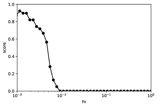 Relationship between the risk regularization () and the percentage of correctly classified labeled samples (score). Note that when is greater than about 0.01, all samples are classified as unchanged, and thus, the score equals zero.