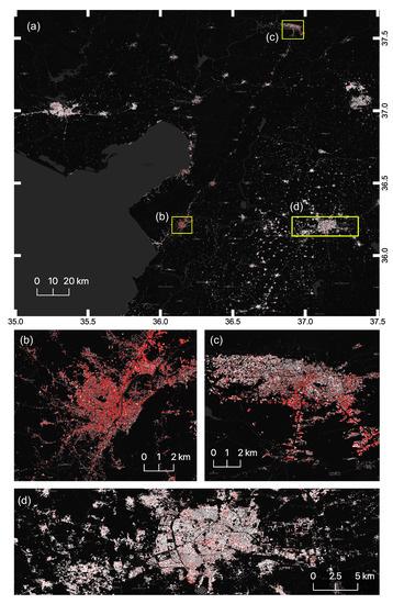(a) Map of changes in the urban footprint. Red and white pixels denote changed and unchanged pixels in the urban footprint, respectively. Closer views of the cities of Antakya, Kahramanmaraş, and Aleppo are shown in (b–d), respectively.