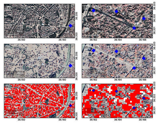 Closer look at the results using Google Earth images of Hatay. (a,b) Images recorded in December 2022 (image from Google, © 2023 Maxar Technologies). (c,d) Images recorded in April 2023 (image from Google, © 2023 Airbus). (e,f) Changes detected using the proposed method (base image from Google, © 2023 Airbus). Red tones denote areas with changes, and white tones are areas without changes. Blue marks denote the locations of the photos shown in Figure 8.