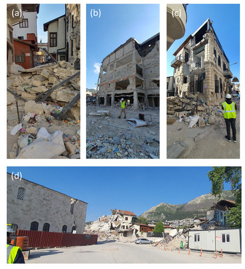 Photos of buildings heavily damaged and collapsed during the 2023 Kahramanmaras, Turkey, earthquakes. The photos were captured on 23 April 2023. The locations of the photos are shown in Figure 7. (a) Obstruction of a narrow street because of debris from the collapse of a building’s wall. (b) The collapse of infill walls of a five-storey building. (c) The collapse of infill walls of a three-storey building. Note that the roofs of the buildings in (b,c), although severely damaged, were almost unchanged. (d) View of a collapsed wall in a building (left) and a collapsed building (center).