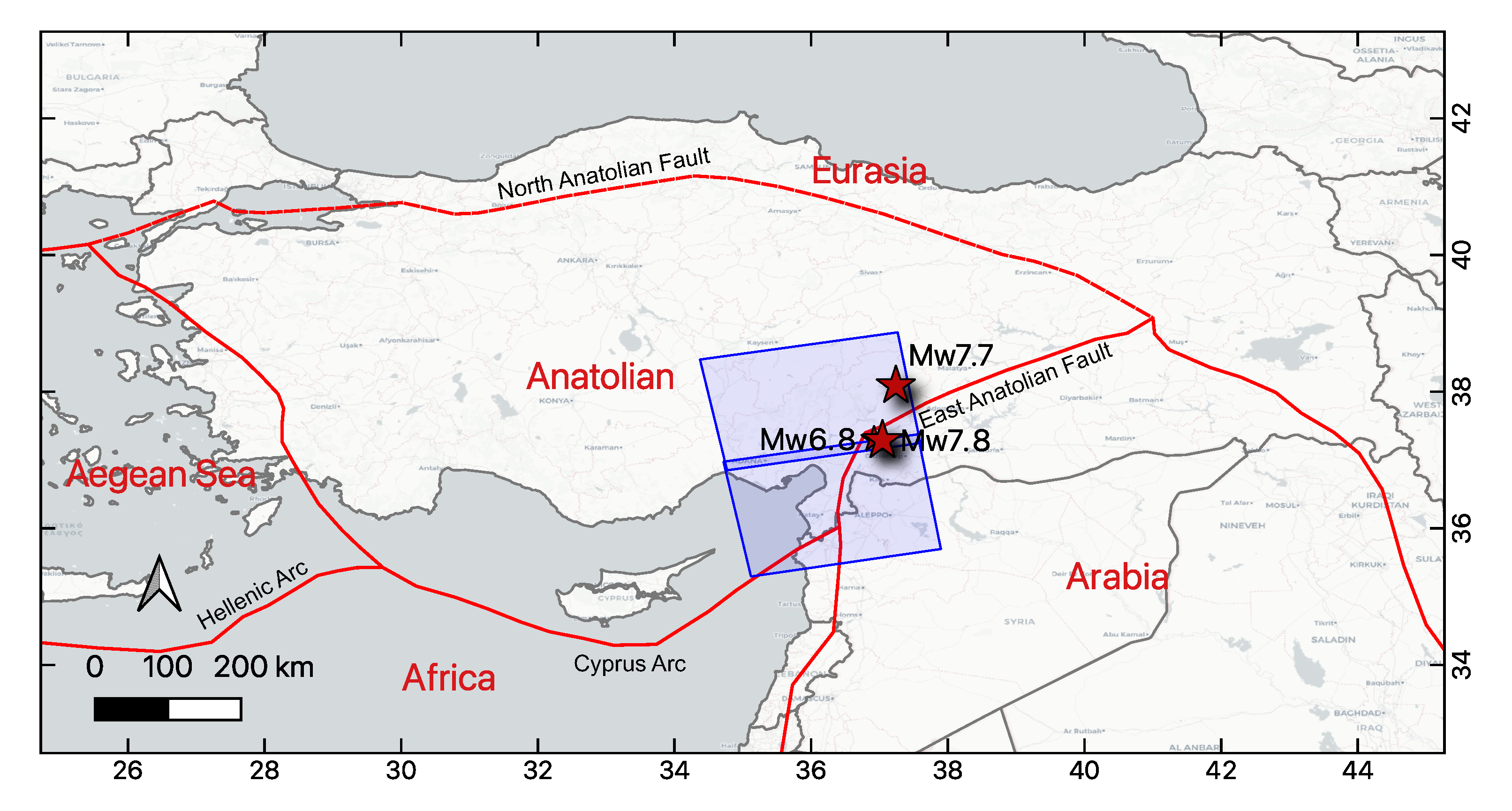 Most of Turkey is located on the Anatolian block and parts of the Eurasian, African, and Arabian plates (Figure 2). The Anatolian block is limited by the North Anatolian Fault in the north, the Hellenic and Cyprus subduction zones in the south, and the East Anatolian Fault in the east. The East Anatolian fault is a 700 km long lateral strike-slip fault. Geodetic, geomorphic, and paleoseismic studies indicate a slip rate of 10 mm/year [47]. On 6 February 2023 at 4:17 a.m. (UTC+3), an Mw 7.8 earthquake struck south–central Turkey and the north of Syria. The event induced a large number of aftershocks, including a second large Mw 7.7 event that occurred at 13:24 on the same day. All these events were produced by the East Anatolian fault system [48].