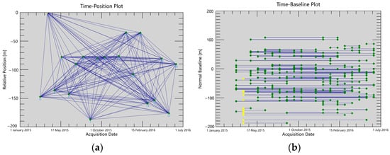Figure 2 illustrates the experimental setup of the SAR pairs’ connection diagram. The experiment set thresholds of spatial and temporal baselines as 300 m and 200 days, respectively. The SAR data acquired on 2 April 2015 were selected as the super master image; others were co-registered and resampled. Other images that meet the threshold condition also generate interferometric pairs, resulting in 78 differential interferometric images.
