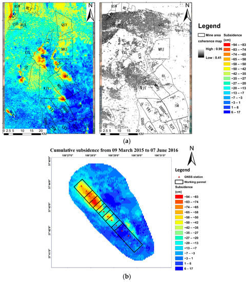 (a) Cumulative deformation and coherence maps in the Ningdong coalfield. (b) Cumulative deformation map in the SGY from March 2015 to June 2016.