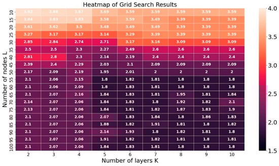 Step 3: Parameter optimization. To construct an accurate LSTM prediction model, several parameters need to be considered, including the sample partition length (L), network layer number (K), and feature number (S) of each LSTM hidden layer [,]. This paper employs a multi-layer grid search method to explore these parameters and selects the parameter combination with the highest average prediction accuracy as the optimal choice. The accuracy is determined by minimizing the prediction error (ε) between the predicted sample (Ypre) and the actual sample (Y). The objective function is expressed as follows:
