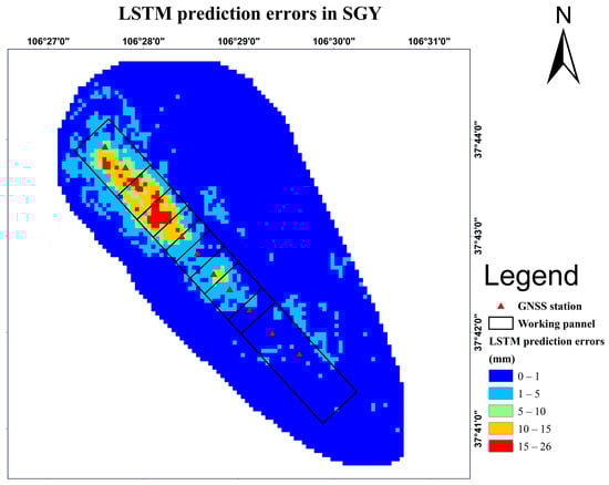 Figure 10 presents the settlement prediction results of the SGY mining area at the overall experimental scale. To obtain these results, the last 15 groups of deformation data from 20 May 2015 to 14 May 2016 were used as training samples to predict the deformation results of 7 June 2016. The predicted results were compared with the measured deformation results of InSAR, and the analysis showed a high degree of consistency between the predicted and real shape variables, indicating that the predicted settlement center area was clear and accurate. Moreover, the prediction errors of each monitoring point in the subsidence area were within 3 cm. Figure 11 presents the prediction errors of LSTM. Out of 4795 observation points, the maximum difference (cumulative) shape variable had a prediction error of 2.6 cm, and the average prediction accuracy reached 93.6%. The calculation method of relevant indicators is given in Equations (9)–(12). Therefore, the model proposed in this paper has a small deviation when compared with the actual settlement amount, effectively reflecting the basic law of land surface settlement changing with time, and the predicted results are reliable.