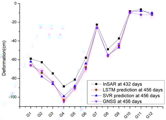 Table 3 presents the InSAR monitoring deformation cumulants of the SGY coal mine surface GNSS observation points over 432 consecutive days in the second column, while the third column displays the GNSS monitoring deformation cumulants over 456 consecutive days. Additionally, the fourth and fifth columns exhibit the cumulative shape variables predicted for 456 consecutive days by the LSTM algorithm and SVR algorithm, respectively. Figure 12 corresponds to the data presented in Table 3, showcasing the close proximity of the predicted values of the LSTM algorithm and the SVR algorithm to the GNSS monitoring results. Furthermore, the LSTM algorithm’s predicted values align with the GNSS monitoring values at multiple monitoring points, suggesting a high level of prediction accuracy. Thus, qualitatively, the results indicate the efficacy of the LSTM method in predicting cumulative shape variables.