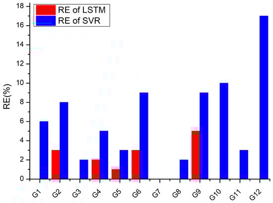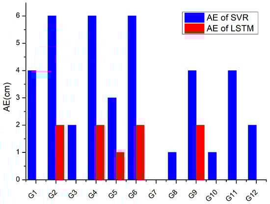 The bar charts displayed in Figure 13 and Figure 14 demonstrate the error distribution of prediction results for 12 GNSS monitoring points, revealing both the absolute and relative prediction errors of the LSTM and SVR prediction methods. These error metrics serve as quantitative indicators to assess the prediction accuracy of the two methods. The absolute and relative errors of the LSTM prediction at the 12 monitoring stations are smaller than those of the SVR prediction results. Specifically, the LSTM prediction method reports a zero error at G1, G3, G7, G8, G10, G11, and G12, whereas the SVR prediction method only has a zero error at the G7 observation station. The highest prediction error for both methods was observed at G2, G4, and G4 observation stations, with the LSTM method reporting an absolute error of 2 cm and the SVR method reporting an absolute error of 6 cm. This may be attributed to their central location within the subsidence basin, where mining activities were intensive over the 456-day inland. The deformation of these measuring points is influenced by multiple factors, such as geological structure, mining speed, and coal pillar, resulting in a more complex settlement pattern. The LSTM algorithm, with its superior learning ability, demonstrated a higher prediction accuracy compared to the SVR algorithm. Notably, the relative error between the predicted value and the truth value of the SVR method at the G12 station is at most 14%, with an absolute error of 2 cm. This is because G12 is situated at the edge of the subsidence basin with a relatively small subsidence value. However, the prediction accuracy of observation stations such as G1, G11, and G12 located in other subsidence basins is relatively high. These findings suggest that the LSTM method is better equipped to learn the intricate details of the settlement pattern.