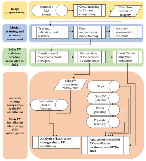 Based on the above-mentioned points, this study aims to achieve the following goals, focusing on the changes in PV cell installation trends in the whole of Vietnam from 2019 to 2022 by constructing solar PV cell maps through the use of deep learning models and satellite imagery: (1) to quantify the changes in LULC associated with the rapid installation of PV cells in Vietnam, (2) to conduct spatial analysis on the development of solar PV cell sites throughout the study period, and (3) to propose policy suggestions for a better solar-integrated society.