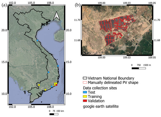 The data collection sites. (a) The distribution of the 0.25° by 0.25° square-shaped areas for training, validation, and test data collection. (b) An example of hand-delineated PV sites overlayed on high-resolution Google Earth satellite imagery.