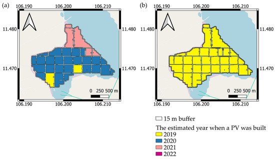To assess the shift in the “new PV site selection strategy”, the following procedure was carried out to estimate the year in which the construction of each PV site began. First, all the PV sites detected in the 2022 satellite imagery were assumed to be constructed in 2022. Next, the 2021 PV map was compared to the 2022 PV extent; if there were PV sites that intersected with more than 50% of the 2022 PV polygon, the year of the initiation of that site’s construction was updated to 2021. This criterion was empirically determined and used to avoid the effects of misclassifying PV pixels in the “built-year estimation” process by ensuring that the PV construction sites were covered by solar panels and not by a small number of misclassified pixels. The same operation was repeated for the 2019 and 2020 PV maps. Typically, large-scale solar PV sites are composed of a set of “islands” of PV panels. Those PVs should belong to the same operating company and be considered a single PV site. To connect these separated polygons into a single PV site datum, PV polygons that fell within a certain distance were considered to be in the same PV site. A 100 m threshold was proposed in the cases of solar farms in Japan and Korea [30], but 30 m was chosen as an appropriate distance in Vietnam after an inspection of the distribution of the PV sites. An example of this post-processing process is shown in Figure 4. The polygons were first reprojected onto Pseudo-Mercator coordinates to apply a buffer of a one-meter unit. Fifteen-meter buffers were created around the exterior of each polygon; then, if the buffers intersected with each other, those objects were classified as belonging to the same PV site. The year of the start of the construction of that PV site was updated to the oldest PV polygon contained in the group.