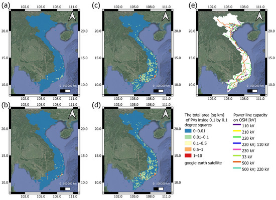 To visualize the change in the distribution of PV sites each year, the entire study site was first divided into a set of 0.1° by 0.1° squares. The area of the intersection of the detected PV sites and each square was calculated and is shown in Figure 5a–d. The major power line map was taken from Open Street Map [57] and is shown in Figure 5e to compare the distribution of solar PV sites to the power transmission infrastructure. The distribution of the PV sites indicates that the coastal areas in the southeast of the country have been significantly utilized for PV panel installation. The comparison among the PV distribution maps in different years shows that PV panel installation surged in 2021 and spread to the inland areas of the southern part of the country. However, the 2022 result shows that the increase in PV sites was limited compared to the previous year.