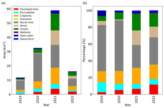 LULC classes used for new PV site installations from 2019 to 2022: (a) the area (km2) of the land cover type used for new PV site installations; (b) the share (%) of the land cover type used for the installation of new PV sites.