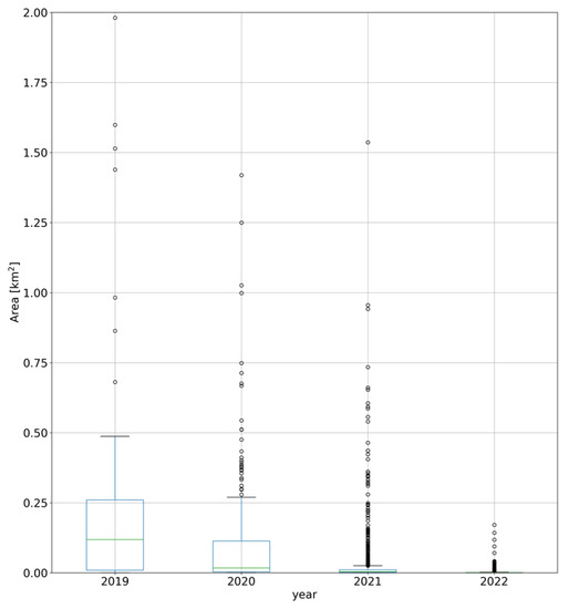 The box plots of the estimated areas of the PV sites classified by the year of construction of the facilities are shown in Figure 7. It can be seen from Figure 7 that the size of the PV sites being newly constructed each year decreased over the 4-year study period. The construction of large solar power plants typically takes several months or years. Consequently, while the construction of the large-scale PV sites would have been mainly initiated in 2019 and 2020, as shown in Figure 7, the peak of solar panel installation is thought to have occurred in 2021, as shown in Figure 6a.