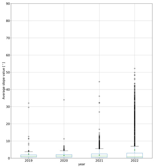 The average slope values within the solar farm perimeters from 2019 to 2022.