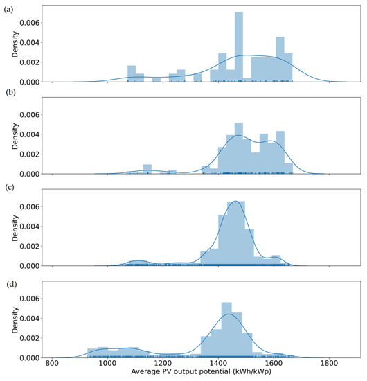 The PV potential data were obtained from the Global Solar Atlas website [55], and the average value for the PV sites installed each year was calculated and is shown in Figure 9. The 2019 and 2020 distributions are similar, and the two value peaks correspond to 1600 kWh/kWp and 1470 kWh/kWp. However, the distribution of the average PV output potential values shifted to lower values in 2021 and 2022, and the values are concentrated to the lower peak of around 1470 kWh/kWp.