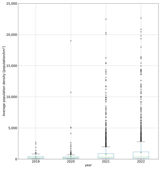 The average population density around the newly installed PV sites was calculated by comparing the extent of the predicted PV site and the population density data in 2018. The results are summarized in Figure 10. It was shown that in contrast to the previous two years, densely populated areas were chosen for PV installation sites in 2021 and 2022. The data from the years 2021 and 2022 indicate a clear shift as more developed and populated regions were chosen as locations for the construction of new PV sites.