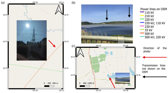 The field survey results of the electrical grid in Đồng Nai and Bà Rịa–Vũng Tàu Provinces: (a) an example of the observed transmission towers and energy grids in the field survey region; (b) an transmission tower unrecorded on the OSM; (c) The location of the photo and the areas where transmission towers should be located.