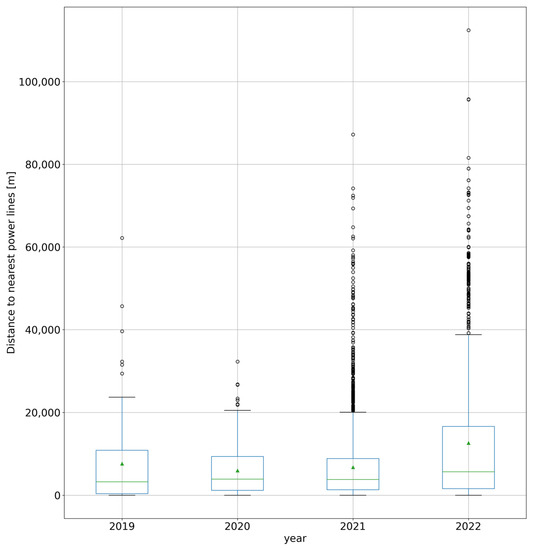 The distance from a PV site to the nearest power lines listed on the OSM was calculated using the geopandas.GeoDataFrame.distance() method after reprojecting both the power line data and the PV site maps onto the “VN-2000/UTM zone 48N” projection, which covers the whole of Vietnam in meter units. The results are shown in Figure 12. The distributions of the newly built PV sites to the closest power grids in 2019 and 2020 were quite similar, while in 2021 and 2022, the solar farms could have been placed in distant locations from the power lines.