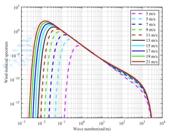 Figure 1 shows the wind-driven wave spectrum for wind speeds from 3 m/s to 21 m/s with a 2 m/s step. As shown in the figure, the cut-off wave number is about 1–10 rad/m. The cut-off wave number divides the spectrum into two parts, the part less than the cut-off wave number is large-scale roughness, and the part greater than the cut-off wave number is small-scale roughness. With the increase in wind speed, the total energy of the wind wave increases, the spectral peak moves towards the direction of large-scale roughness, and the diffuse reflection increases.