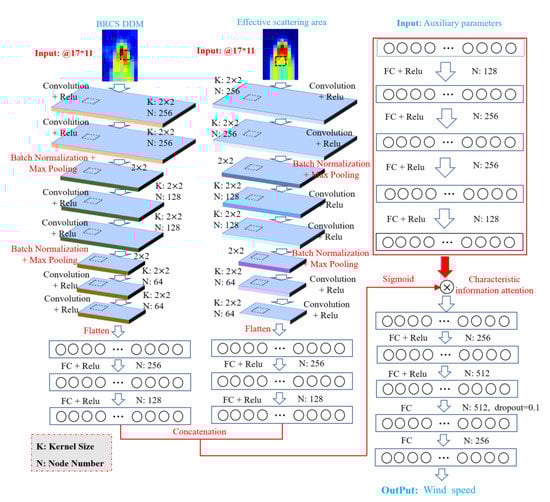 In addition to determining the rainfall intensity on the sea surface, this study also retrieves the sea surface wind speed. Therefore, we propose a deep convolutional neural network model incorporating an attention mechanism (AM-DCNN) for wind speed retrieval, which is an improved version of the GloWS-Net model proposed by Bu et al. [], that is, the attention mechanism is introduced into the GloWS-Net framework. In neural network learning, the more parameters a model has, the stronger its expressive power is and the greater the amount of information stored in the model, which can lead to the issues of information overload. Attention mechanism is a resource allocation scheme, and it is the main means to solve the problem of information overload. It allocates computing resources to more important tasks to improve the efficiency and accuracy of task processing. The AM-DCNN model designed in this study is shown in Figure 3.